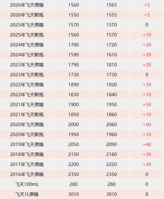 其中,2026年飛天茅臺(tái)行情1565元,微漲5元/瓶左右,終端市場(chǎng)價(jià)格已經(jīng)超過(guò)1600元/瓶;25年散瓶飛天茅臺(tái)行情1570元,微漲10元/瓶左右;2024年飛天茅臺(tái)行情1720元,上漲20元/瓶。此外,丙午馬年經(jīng)典款行情2900元,上漲240元/瓶。