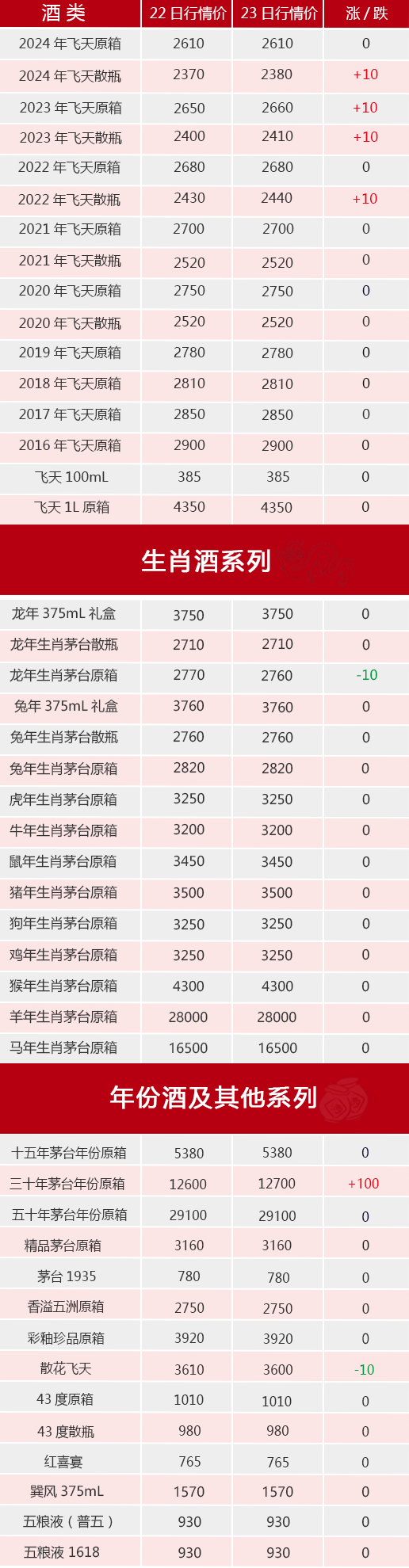 今日茅臺酒行情價:飛天系列,2022~2024年散瓶和2023年原箱漲10元/瓶;生肖系列,龍年原箱跌10元/瓶;其他系列:散花飛天跌10元/瓶,三十年漲100元/瓶。