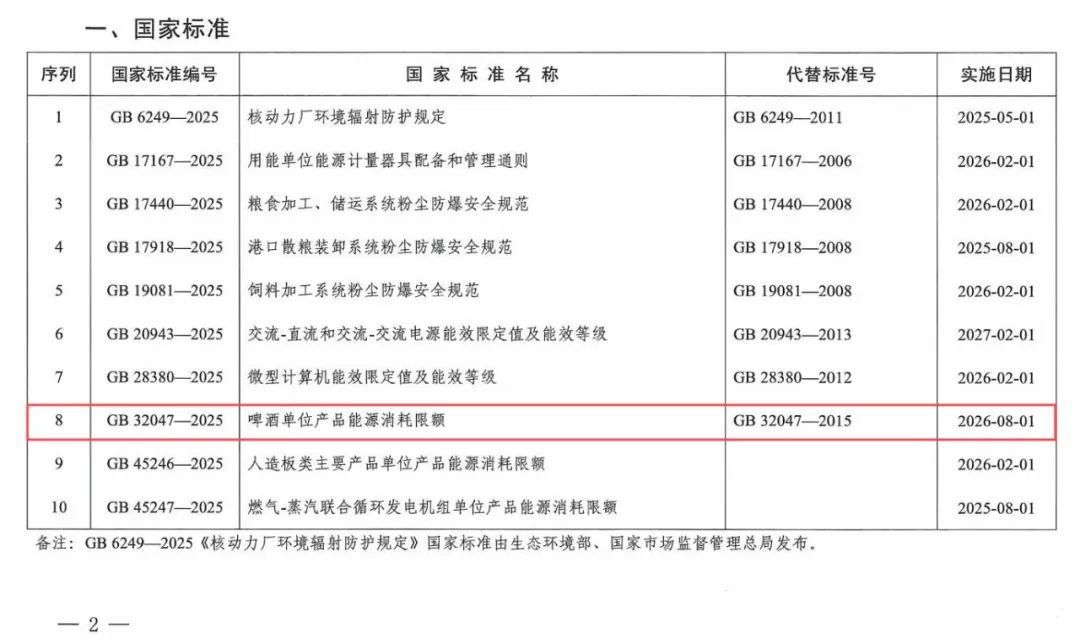 1月24日,國家市場監管總局、國家標準化管理委員會發布公告(2025年第1號),正式批準《啤酒單位產品能源消耗限額》強制性國家標準發布,2026年8月1日起實施。標志著啤酒生產領域在能耗控制層面被賦予了更新、更高的要求,將推動企業重新審視生產模式,深挖節能潛力,為行業綠色發展明確方向,為可持續發展注入動力。