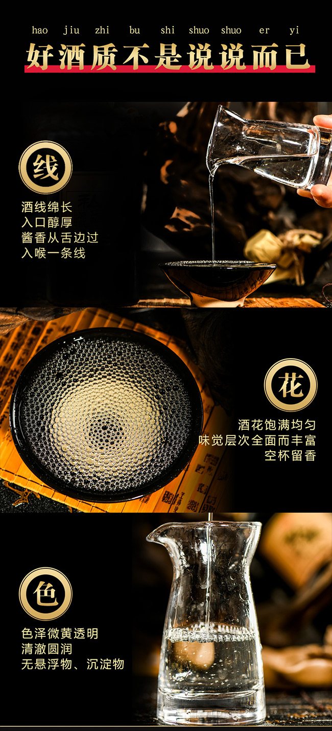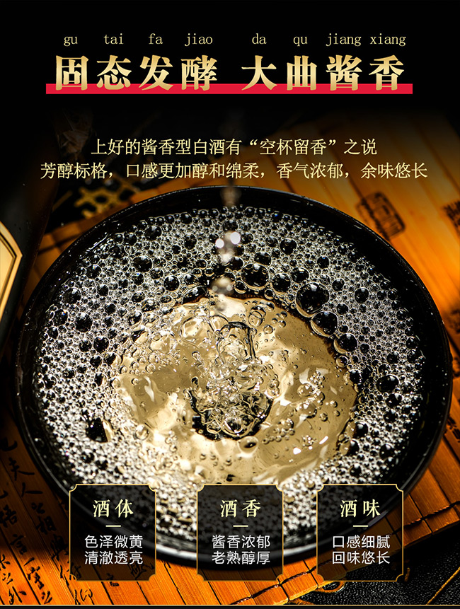 產品特點:酒味豐滿醇厚、幽雅細膩、回味悠久、空杯留香、香而不艷、低而不淡、醇香幽雅、不濃不猛、回味悠長