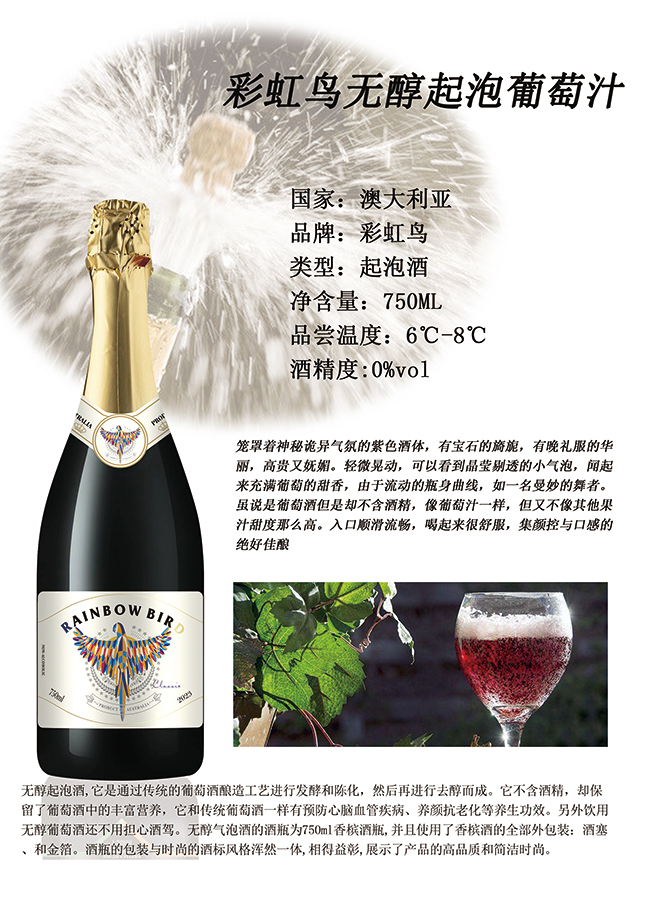 雖說是葡萄酒但是卻不含酒精,像葡萄汁-樣,但又不像其他果汁甜度那么高。入口順滑流暢,喝起來很舒服,集顏控與口感的絕好佳釀。