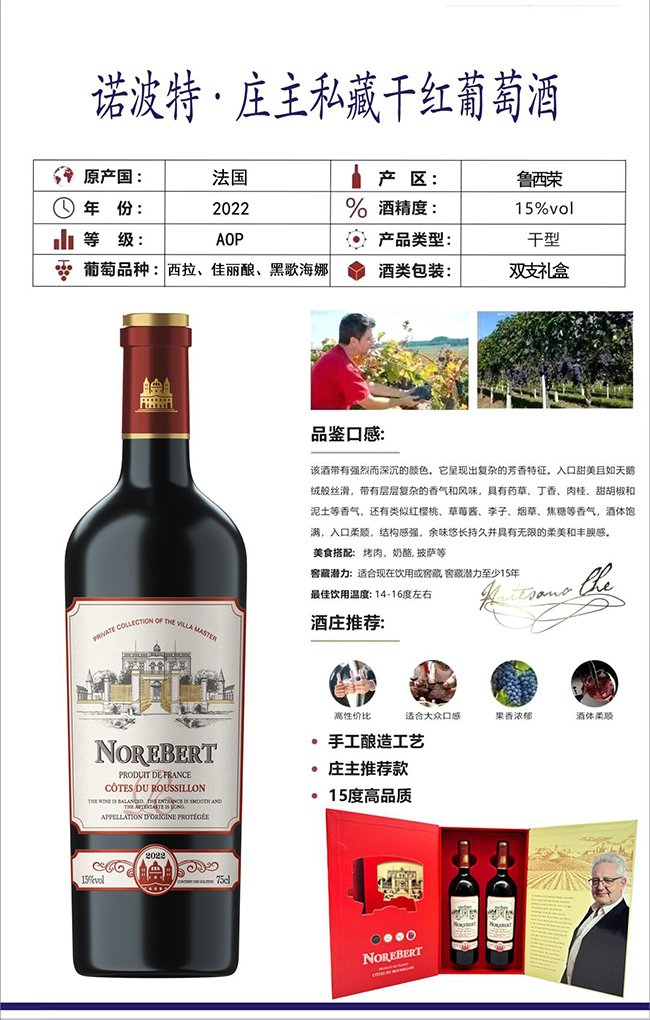 品鑒口感:該酒帶有強烈而深沉的顏色。它呈現出復雜的芳香特征。入口甜美且如天鵝絨般絲滑,帶有層層復雜的香氣和風味,具有藥草、丁香、肉桂、甜胡椒和泥土等香氣,還有類似紅櫻桃、草莓醬、李子、煙草、焦糖等香氣,酒體飽滿,入口柔順,結構感強,余味悠長持久并具有無限的柔美和豐腴感。