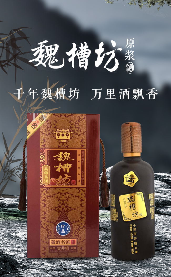 安徽魏槽坊酒業有限責任公司座落在華夏酒城安徽白酒之鄉——亳州市古井鎮。地處大京九鐵路沿線,自古以來,人杰地靈、物華天寶、資源豐富。公司釀造的白酒是通過“擇層取醅”、“擇時摘酒”等傳統技術,得到精華的原漿美酒,再放入地下酒庫經陶壇洞藏一定年限,使其自然老熟。