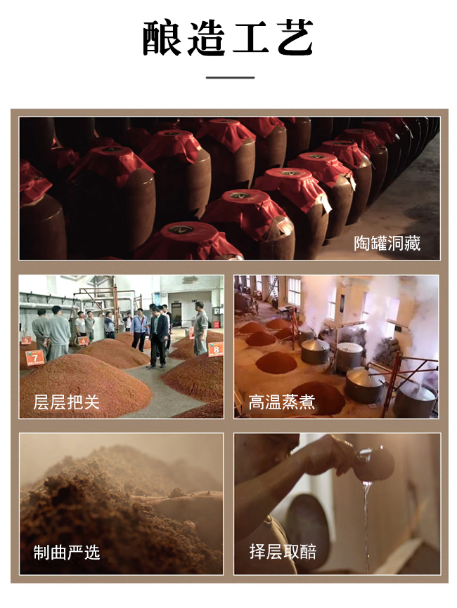 釀造的白酒是通過“擇層取醅”、“擇時摘酒”等傳統技術,得到精華的原漿美酒,再放入地下酒庫經陶壇洞藏一定年限,使其自然老熟。其以色澤清透、口感柔順、香味自然、回味甘美、醇和怡人的特征,獲得了廣大消費者的好評和厚愛。