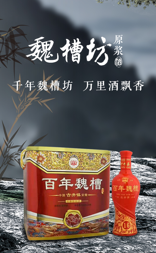 安徽魏槽坊酒業(yè)有限責(zé)任公司座落在華夏酒城安徽白酒之鄉(xiāng)——亳州市古井鎮(zhèn)。地處大京九鐵路沿線,自古以來,人杰地靈、物華天寶、資源豐富。公司釀造的白酒是通過“擇層取醅”、“擇時(shí)摘酒”等傳統(tǒng)技術(shù),得到精華的原漿美酒,再放入地下酒庫經(jīng)陶壇洞藏一定年限,使其自然老熟。