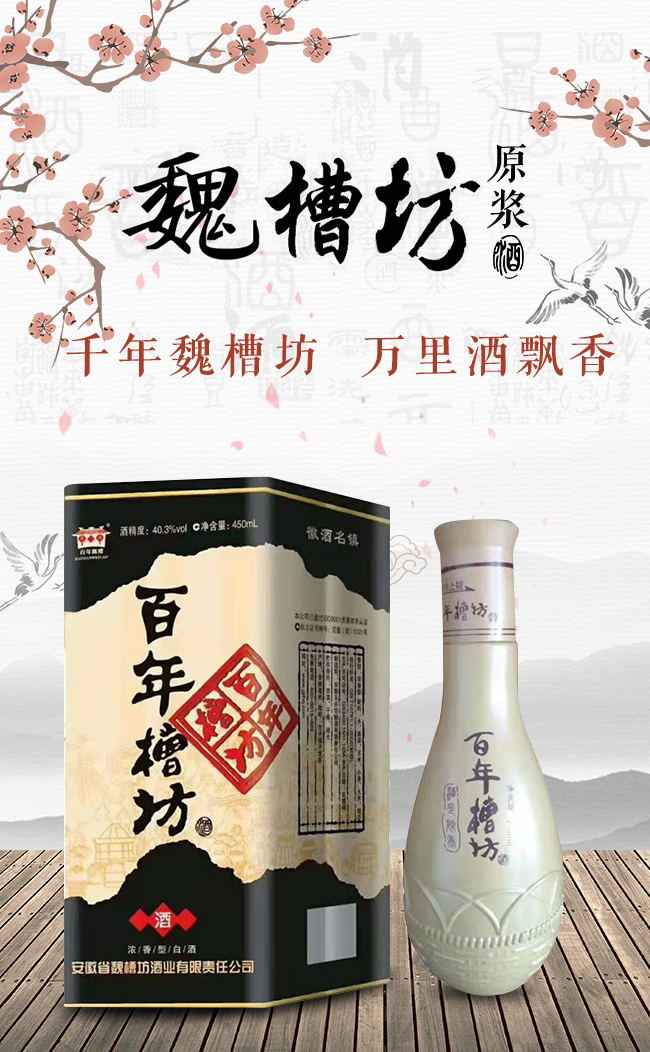安徽魏槽坊酒業有限責任公司座落在華夏酒城安徽白酒之鄉——亳州市古井鎮。地處大京九鐵路沿線,自古以來,人杰地靈、物華天寶、資源豐富。公司釀造的白酒是通過“擇層取醅”、“擇時摘酒”等傳統技術,得到精華的原漿美酒,再放入地下酒庫經陶壇洞藏一定年限,使其自然老熟。