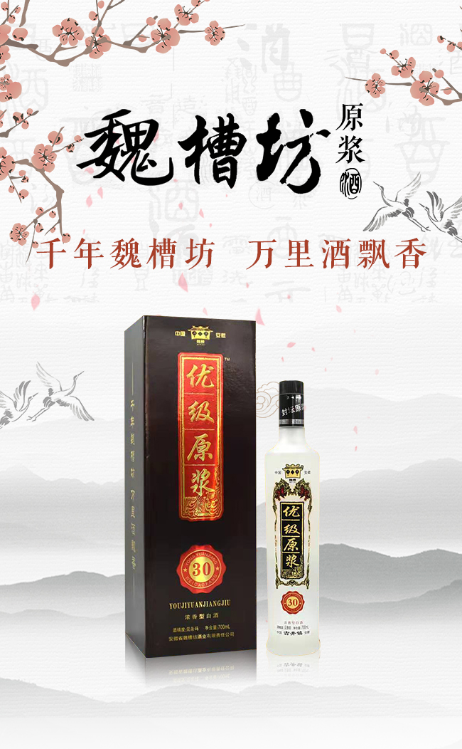 安徽魏槽坊酒業有限責任公司座落在華夏酒城安徽白酒之鄉——亳州市古井鎮。地處大京九鐵路沿線,自古以來,人杰地靈、物華天寶、資源豐富。公司釀造的白酒是通過“擇層取醅”、“擇時摘酒”等傳統技術,得到精華的原漿美酒,再放入地下酒庫經陶壇洞藏一定年限,使其自然老熟。