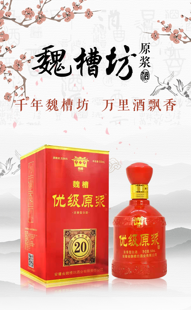 安徽魏槽坊酒業有限責任公司座落在華夏酒城安徽白酒之鄉——亳州市古井鎮。地處大京九鐵路沿線,自古以來,人杰地靈、物華天寶、資源豐富。公司釀造的白酒是通過“擇層取醅”、“擇時摘酒”等傳統技術,得到精華的原漿美酒,再放入地下酒庫經陶壇洞藏一定年限,使其自然老熟。