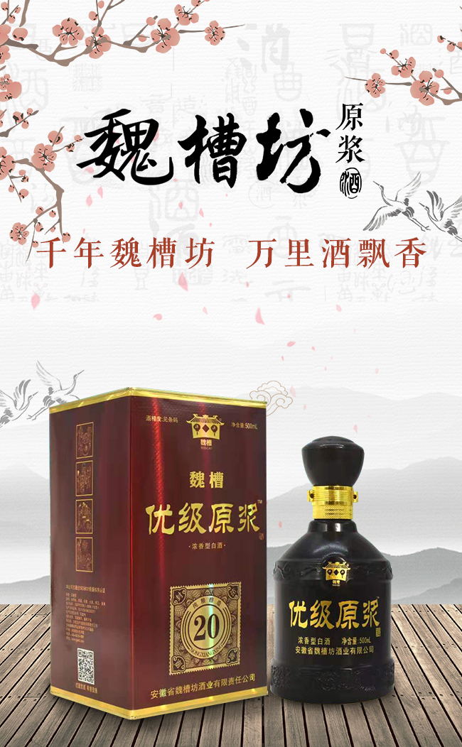 安徽魏槽坊酒業有限責任公司座落在華夏酒城安徽白酒之鄉——亳州市古井鎮。地處大京九鐵路沿線,自古以來,人杰地靈、物華天寶、資源豐富。公司釀造的白酒是通過“擇層取醅”、“擇時摘酒”等傳統技術,得到精華的原漿美酒,再放入地下酒庫經陶壇洞藏一定年限,使其自然老熟。