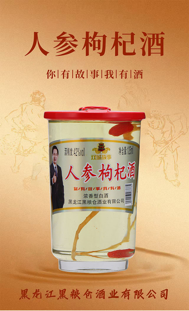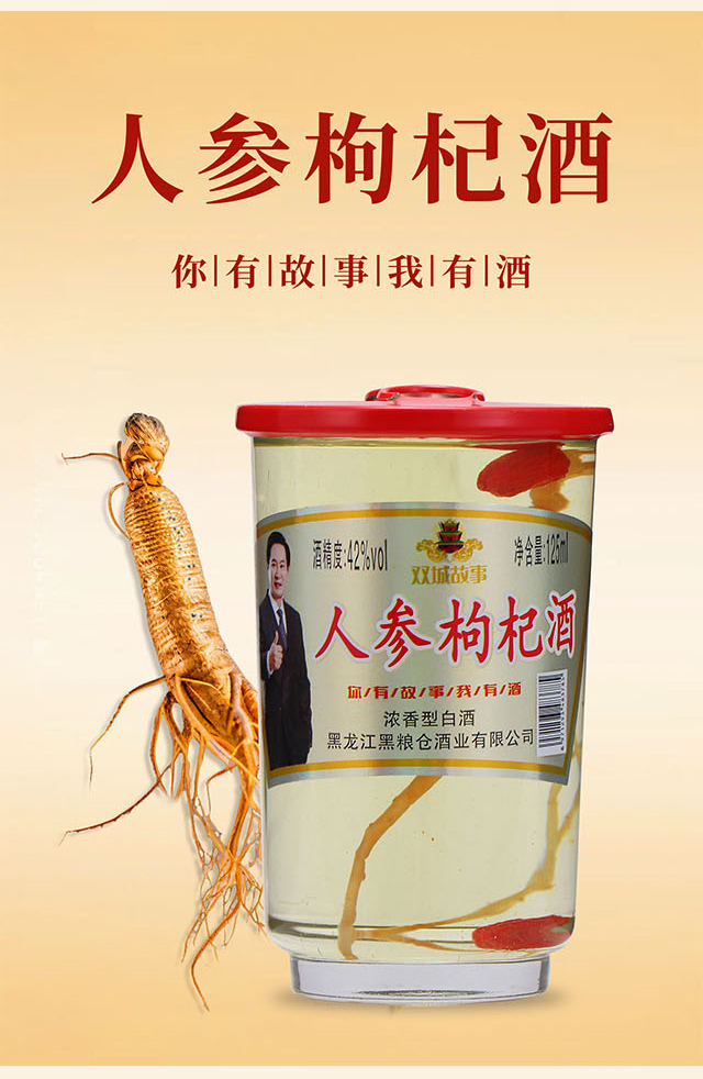 配料:高梁酒(蒸餾酒)、枸杞、白砂糖、人參(人工種植五年及五年以下)
