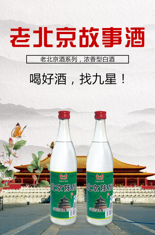 北京九星酒業有限公司是一家集產品研發,生產銷售為一體的現代化白酒規模企業。目前開發的主要是皇城門系列白酒產品。是以優質高粱為主要原料,用大麥、小麥、豌豆制成大曲,輔多種微生物為糖化酵劑,再經過長期發酵,緩慢蒸餾,取之精華,經多年陳貯后,精心勾兌而成。以“清香幽雅,醇厚綿甜,尾昧爽凈”的獨特風格,深受各界朋友的青睞。
