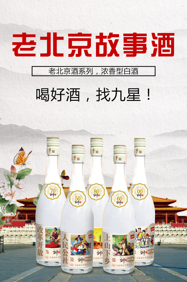 北京九星酒業有限公司是一家集產品研發,生產銷售為一體的現代化白酒規模企業。目前開發的主要是皇城門系列白酒產品。是以優質高粱為主要原料,用大麥、小麥、豌豆制成大曲,輔多種微生物為糖化酵劑,再經過長期發酵,緩慢蒸餾,取之精華,經多年陳貯后,精心勾兌而成。以“清香幽雅,醇厚綿甜,尾昧爽凈”的獨特風格,深受各界朋友的青睞。