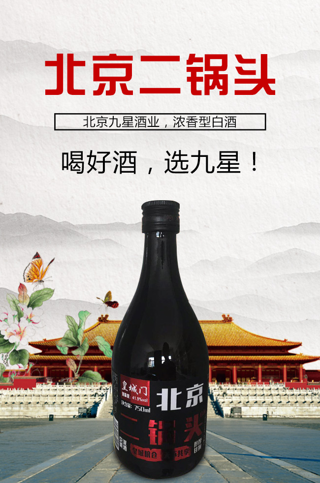 北京九星酒業有限公司是一家集產品研發,生產銷售為一體的現代化白酒規模企業。目前開發的主要是皇城門系列白酒產品。是以優質高粱為主要原料,用大麥、小麥、豌豆制成大曲,輔多種微生物為糖化酵劑,再經過長期發酵,緩慢蒸餾,取之精華,經多年陳貯后,精心勾兌而成。以“清香幽雅,醇厚綿甜,尾昧爽凈”的獨特風格,深受各界朋友的青睞。