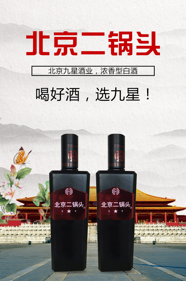 北京九星酒業有限公司是一家集產品研發,生產銷售為一體的現代化白酒規模企業。目前開發的主要是皇城門系列白酒產品。是以優質高粱為主要原料,用大麥、小麥、豌豆制成大曲,輔多種微生物為糖化酵劑,再經過長期發酵,緩慢蒸餾,取之精華,經多年陳貯后,精心勾兌而成。以“清香幽雅,醇厚綿甜,尾昧爽凈”的獨特風格,深受各界朋友的青睞。