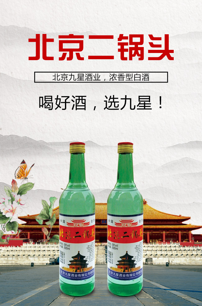 北京九星酒業有限公司是一家集產品研發,生產銷售為一體的現代化白酒規模企業。目前開發的主要是皇城門系列白酒產品。是以優質高粱為主要原料,用大麥、小麥、豌豆制成大曲,輔多種微生物為糖化酵劑,再經過長期發酵,緩慢蒸餾,取之精華,經多年陳貯后,精心勾兌而成。以“清香幽雅,醇厚綿甜,尾昧爽凈”的獨特風格,深受各界朋友的青睞。