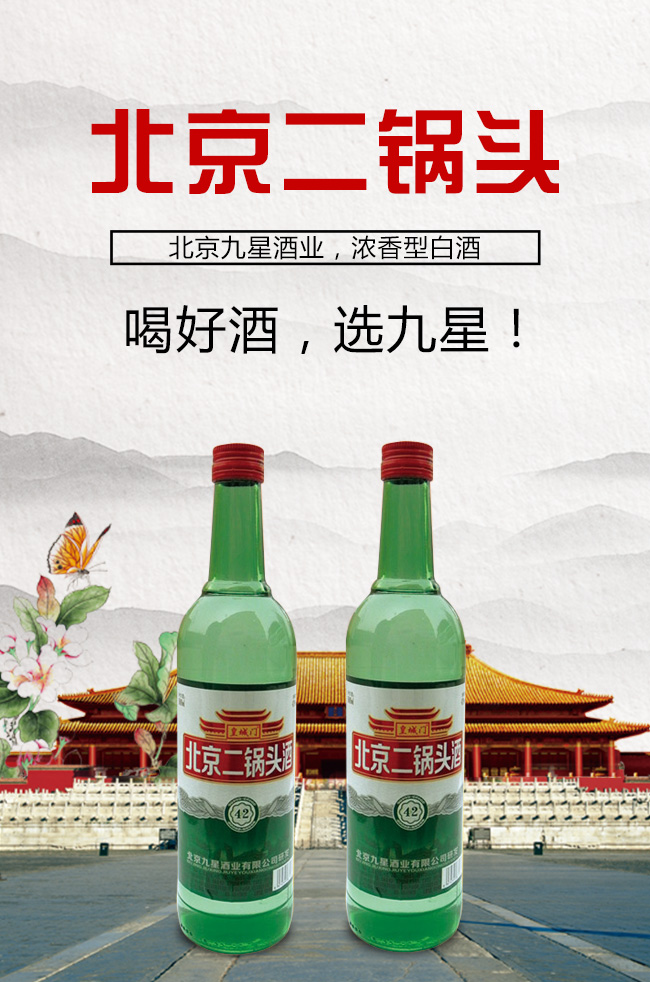北京九星酒業有限公司是一家集產品研發,生產銷售為一體的現代化白酒規模企業。目前開發的主要是皇城門系列白酒產品。是以優質高粱為主要原料,用大麥、小麥、豌豆制成大曲,輔多種微生物為糖化酵劑,再經過長期發酵,緩慢蒸餾,取之精華,經多年陳貯后,精心勾兌而成。以“清香幽雅,醇厚綿甜,尾昧爽凈”的獨特風格,深受各界朋友的青睞。