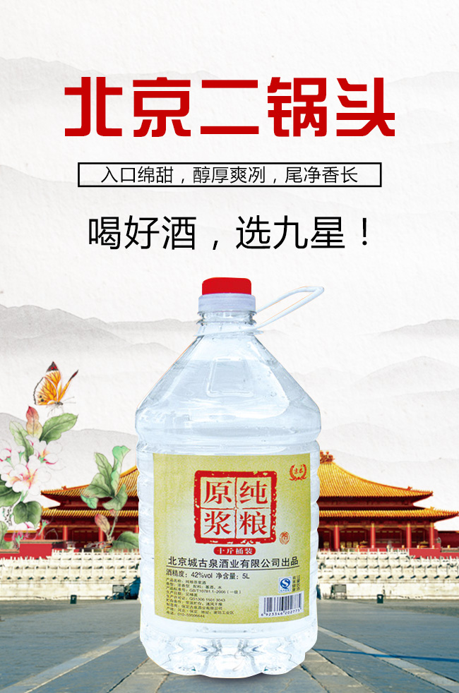 產(chǎn)品名:京恭純糧原漿酒42°5L(玻璃壇)
