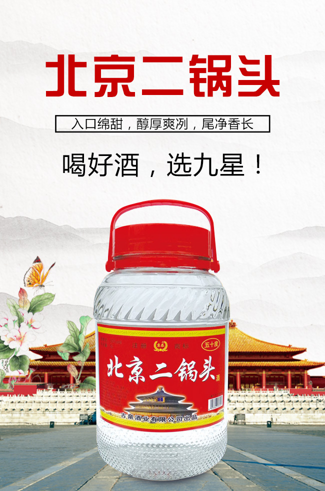 北京九星酒業有限公司是一家集產品研發,生產銷售為一體的現代化白酒規模企業。目前開發的主要是皇城門系列白酒產品。是以優質高粱為主要原料,用大麥、小麥、豌豆制成大曲,輔多種微生物為糖化酵劑,再經過長期發酵,緩慢蒸餾,取之精華,經多年陳貯后,精心勾兌而成。以“清香幽雅,醇厚綿甜,尾昧爽凈”的獨特風格,深受各界朋友的青睞。