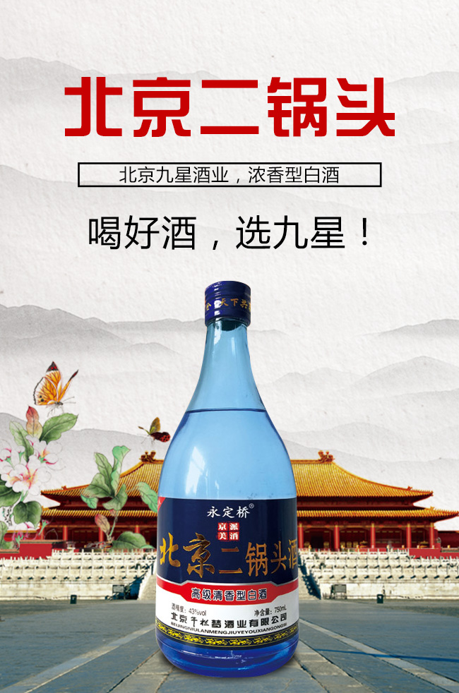 北京九星酒業有限公司是一家集產品研發,生產銷售為一體的現代化白酒規模企業。目前開發的主要是皇城門系列白酒產品。是以優質高粱為主要原料,用大麥、小麥、豌豆制成大曲,輔多種微生物為糖化酵劑,再經過長期發酵,緩慢蒸餾,取之精華,經多年陳貯后,精心勾兌而成。以“清香幽雅,醇厚綿甜,尾昧爽凈”的獨特風格,深受各界朋友的青睞。