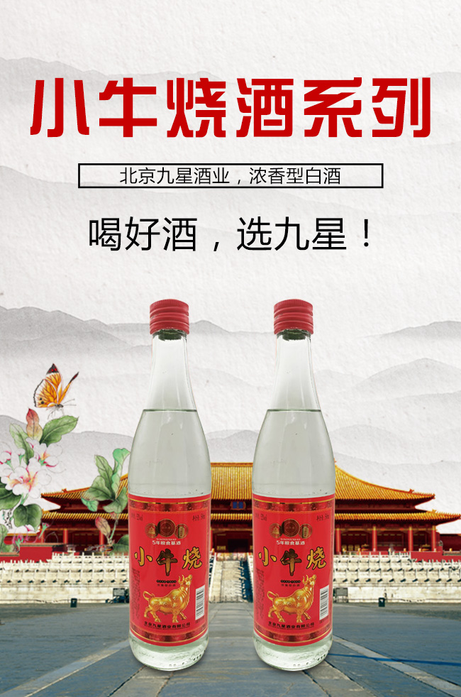 北京九星酒業有限公司是一家集產品研發,生產銷售為一體的現代化白酒規模企業。目前開發的主要是皇城門系列白酒產品。是以優質高粱為主要原料,用大麥、小麥、豌豆制成大曲,輔多種微生物為糖化酵劑,再經過長期發酵,緩慢蒸餾,取之精華,經多年陳貯后,精心勾兌而成。以“清香幽雅,醇厚綿甜,尾昧爽凈”的獨特風格,深受各界朋友的青睞。