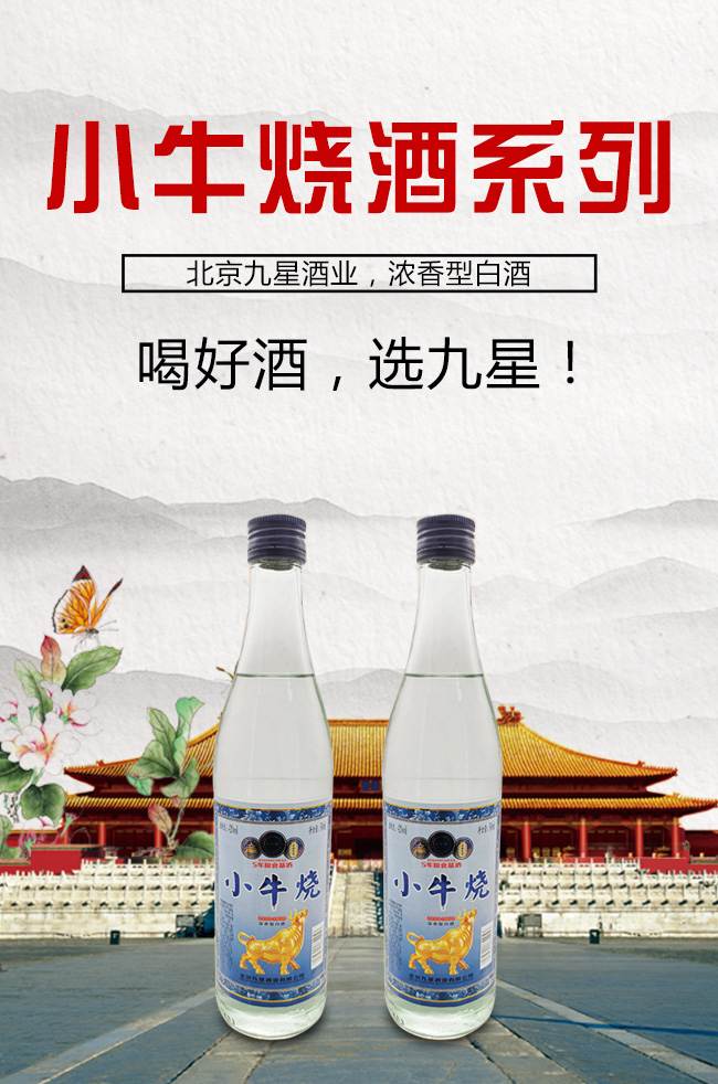 北京九星酒業有限公司是一家集產品研發,生產銷售為一體的現代化白酒規模企業。目前開發的主要是皇城門系列白酒產品。是以優質高粱為主要原料,用大麥、小麥、豌豆制成大曲,輔多種微生物為糖化酵劑,再經過長期發酵,緩慢蒸餾,取之精華,經多年陳貯后,精心勾兌而成。以“清香幽雅,醇厚綿甜,尾昧爽凈”的獨特風格,深受各界朋友的青睞。