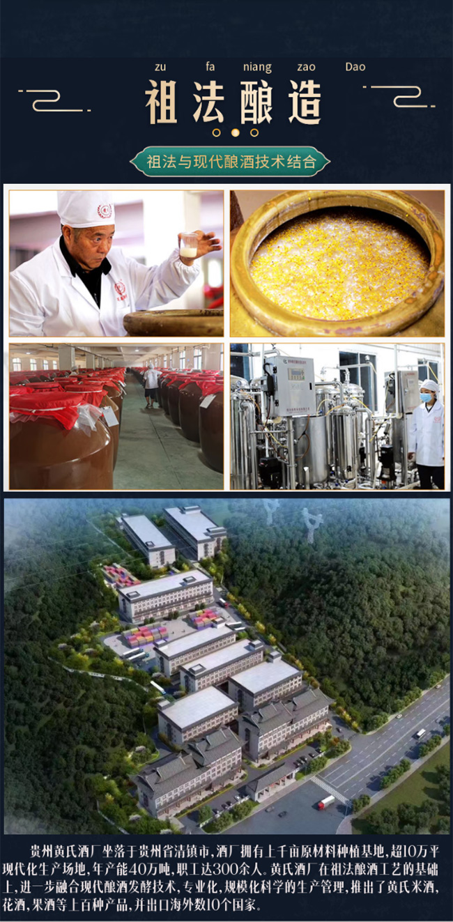 黃氏集團創立于1997年,二十幾年來一直專注于果酒類、米酒類、花酒類、奶酒類、茶酒類、藥酒類等中低度營養酒的生產。至2022年,集團共全資持有兩個大型生產基地,位于貴州省清鎮市的貴州黃氏酒廠有限責任公司以及位于貴州省息烽縣的貴州睿錦坊釀酒有限公司。 總投資超4億元人民幣,占地面積近300畝,建有生產專 用廠房近20萬平米。 安裝有各種原材料處理、發酵、分離、壓榨、過濾、貯存、灌裝等各種設備設施1.5萬臺(套)。至2022年,具備100種類以上,800個以上單品年產量超過10萬噸的各種果酒、米酒、花酒、奶酒、茶酒、藥酒的生產能力。