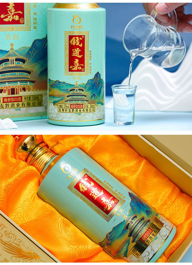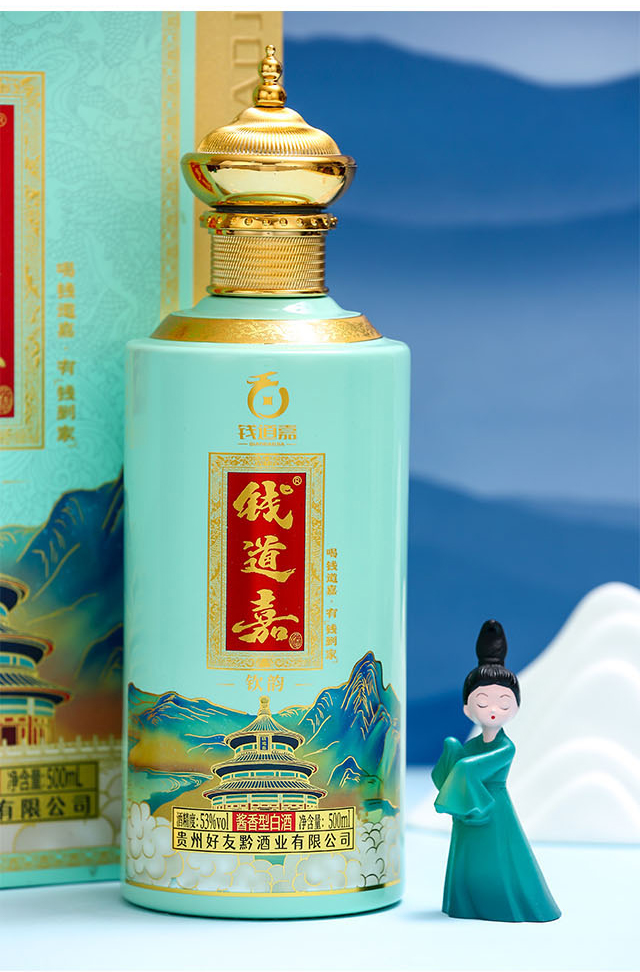 貴州好友黔酒業秉持“酒納萬福,飲酒有道而財自生”的初心,創立了“錢道嘉”品牌。創意來源于大清——乾隆、道光、嘉慶三朝的前三個字“乾道嘉”,諧音為“錢到家”。其中內涵為“乾天中日、運走昌隆、家合平安、富貴永慶”。從創立“錢道嘉”品牌到產品的問世,每一步都心懷對廣大酒友們深深的祝福。品美酒佳釀,感受穿越古今而來的厚重之禮。
