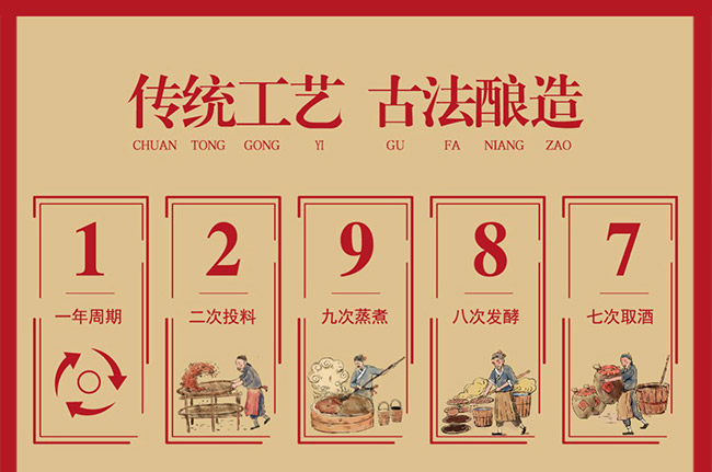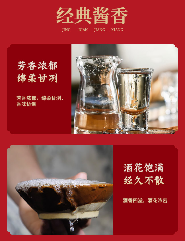 產品特點:酒味豐滿醇厚、幽雅細膩、回味悠久、空杯留香、香而不艷、低而不淡、醇香幽雅、不濃不猛、回味悠長