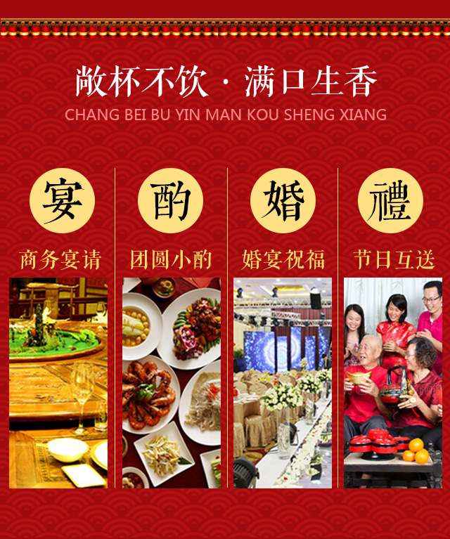 適飲場合:商務(wù)宴會、團(tuán)圓小酌、婚慶宴席、節(jié)日送禮、收藏