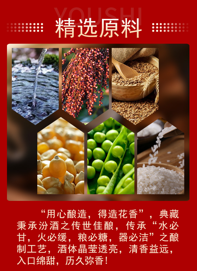 “用心釀造,得造花香”,典藏秉承汾酒之傳世佳釀,傳承“水必甘,火必緩,糧必糖,囂必潔”之釀制工藝,酒體晶瑩透亮,清香益遠,入口綿甜,久爾彌香。