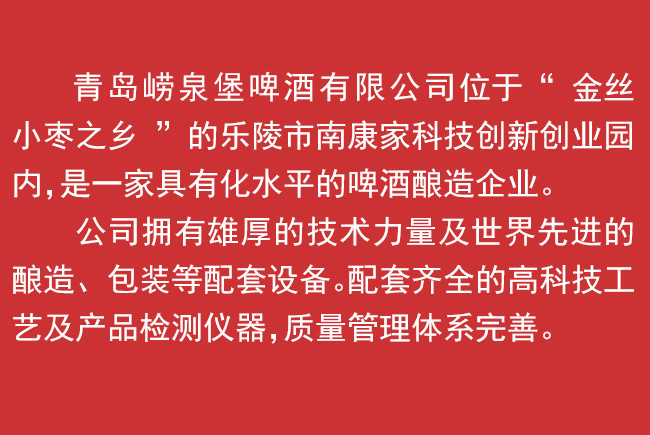青島嶗泉堡啤酒有限公司位于“金絲小棗之鄉(xiāng)”的樂陵市南康家科技創(chuàng)新創(chuàng)業(yè)園內(nèi),成立于2015年3月,注冊資金600萬元人民幣,屬民營企業(yè),主要生產(chǎn)啤酒和飲料制品,是一家具有化水平的啤酒釀造企業(yè),企業(yè)總占地面積33350㎡,年產(chǎn)10萬噸啤酒的規(guī)模,總投資12200萬元,全部由企業(yè)自籌解決。