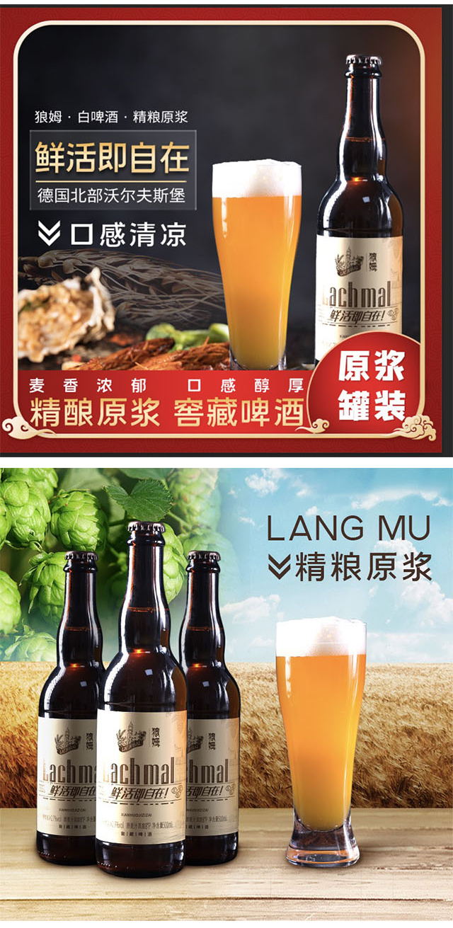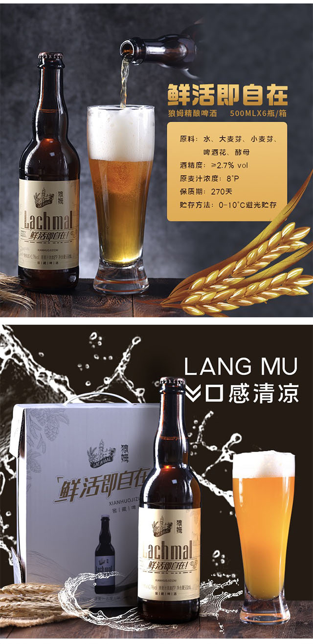 “狼姆”系列啤酒選取北緯38.9°以北的高寒帶一季小麥,高品質優等啤酒花,白狼山—類山泉水及沃隆巴赫先生家族所提供的酵母菌,二次發酵技術和全麥原漿、瓶內發酵、洞中窖藏的特色釀酒工藝,主要成分有維生素B1,B2,B5,B6,B12,蛋白質氨基酸,每一升酒液中含有百億活性酵母,讓“狼姆”品質和味道更加純正。并根據國人的口味需求,研發了獨屬于國人狼姆啤酒系列。