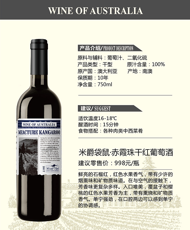 產品名:米爵袋鼠赤霞珠干紅葡萄酒13°750ml