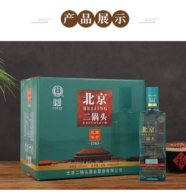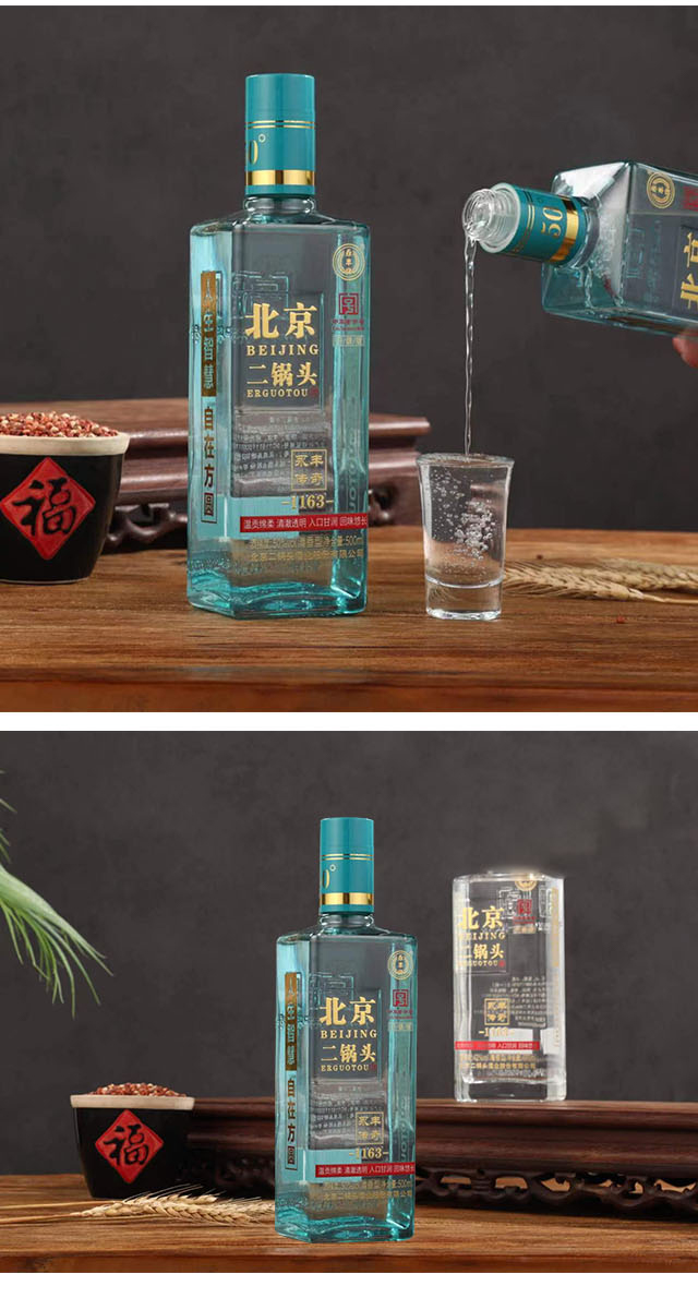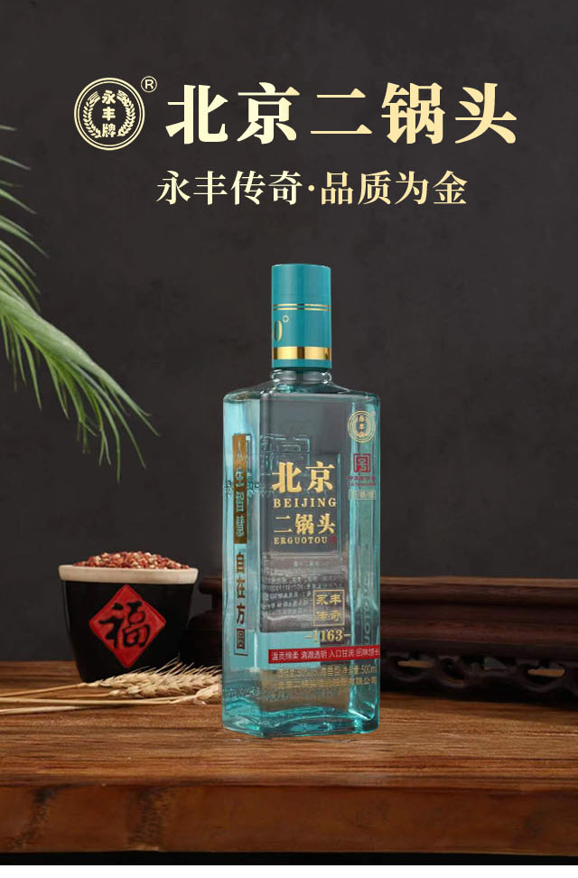 北京二鍋頭酒業股份有限公司,傳承老北京二鍋頭傳統釀造技藝,產品選用優質高粱為原料,以麩曲為糖化發酵劑,采用老五甑發酵法、混蒸混燒、看花接酒、掐頭去尾,長期儲存、精工勾兌而成。