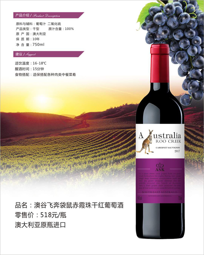 產品名:澳谷飛奔袋鼠赤霞珠干紅葡萄酒13°750ml