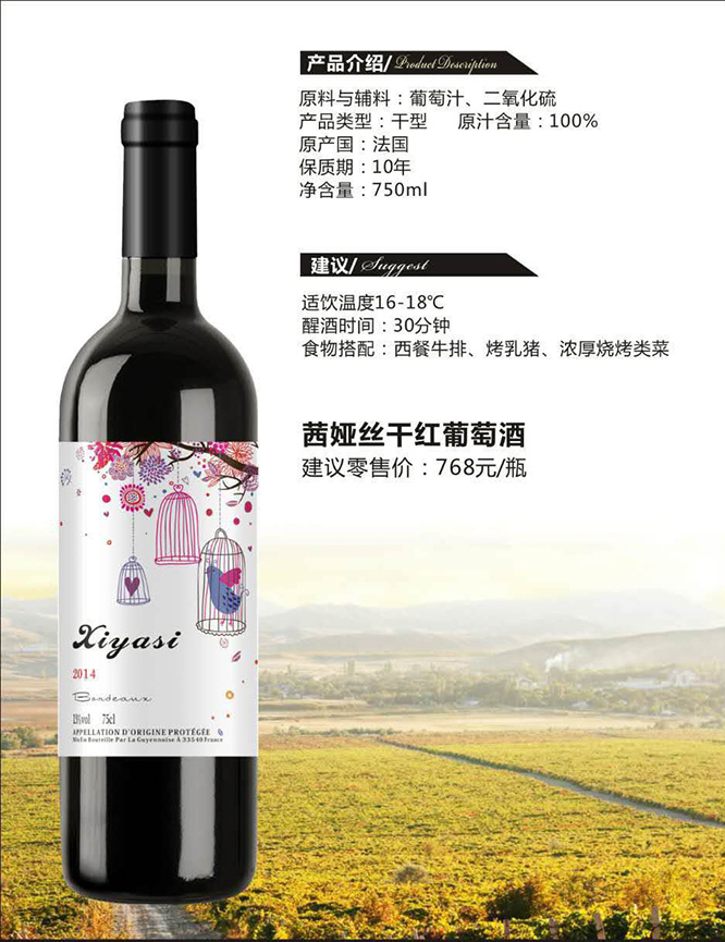 產品名:茜婭絲干紅葡萄酒2014 13°750ml