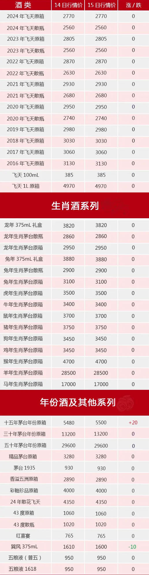 今日茅臺酒行情價:飛天方面和生肖方面無動價;其他系列,十五年漲20元/瓶,巽風375mL跌價10元/瓶。