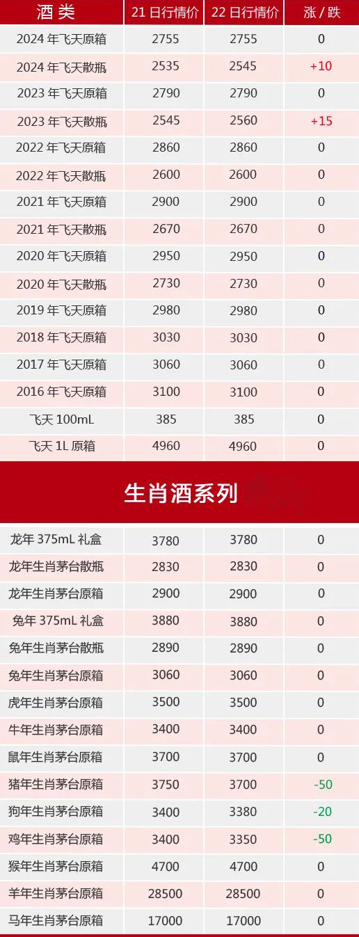 今日茅臺酒行情價:飛天方面,2023年、2024年散瓶漲10-15元/瓶;生肖方面,雞、狗、豬年生肖原箱跌20-50元/瓶;其他系列無動價。