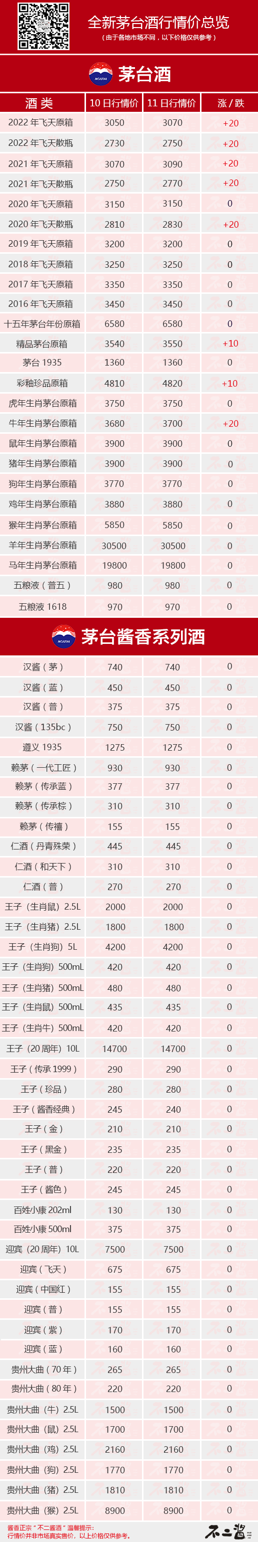 7月11日茅臺(tái)酒行情價(jià)迎來(lái)反彈,全線回漲。飛天方面,新飛天2021及2022散瓶與原箱均有20元/瓶的增幅,2020年散瓶也漲價(jià)20元/瓶。生肖方面,牛年生肖漲20元/瓶,重回3700價(jià)位。其他系列中,精品茅臺(tái)與彩釉珍品上漲10元/瓶。總體而言與昨日跌價(jià)形成動(dòng)態(tài)平衡。