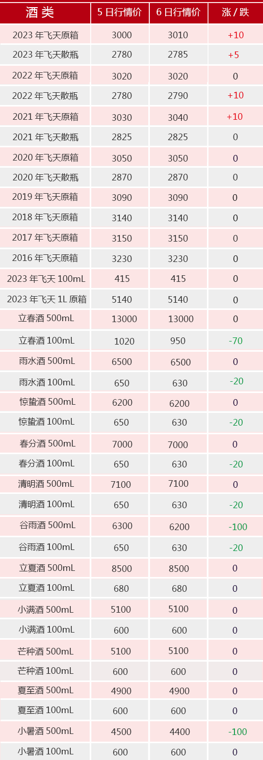 今日茅臺酒行情價。飛天方面,2023年散瓶和原箱、2022年散瓶以及2021年原箱漲5~10元/瓶;生肖方面無動價;其他系列,大瓶谷雨和大暑酒跌100元/瓶,多款小節氣酒跌20~70元/瓶。