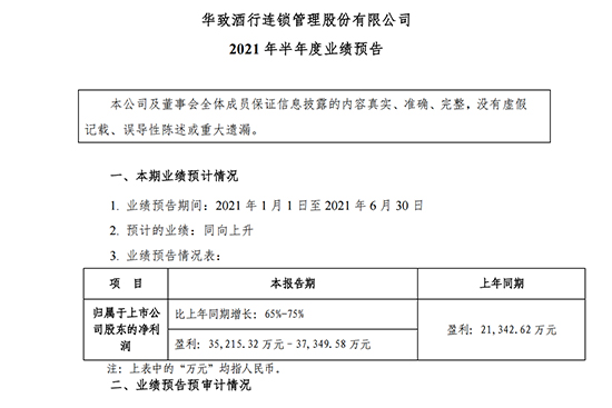 7月6日,華致酒行連鎖管理股份有限公司(以下簡稱“華致酒行”)發布半年度業績預告稱,2021年上半年歸屬于上市公司股東的凈利潤比上年同期增長65%-75%,盈利3.52億元–3.73億元,上年同期盈利為2.13億元;預計2021年上半年實現營業收入在 39.5億元-40.5億元之間,較上年同期增長67.18%-71.41%。