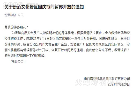 通知中稱,為保障食品安 全及廣大游客的身體健康,根據疫情防控要求,全力做好疫情防控工作,自2021年8月2日起汾酒文化景區一直停止對外開放。國慶期間繼續暫停對外開放,是鑒于目前疫情形勢,結合汾酒公司作為食品生產企業,汾酒生產廠區即為參觀景區的實際情況。(文章來源:新京報)