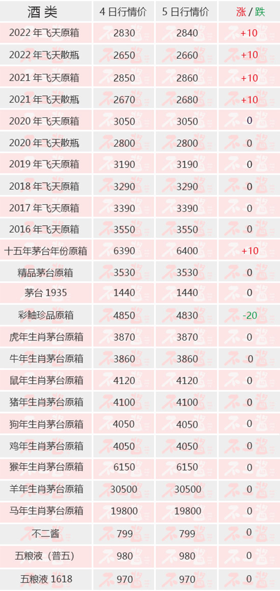 4月5日茅臺酒行情價總體呈現緩漲態勢。飛天方面,2021、2022年的散瓶與原箱均有10元/瓶的小幅漲價。生肖方面未有動價。其他系列中,彩釉珍品跌價20元/瓶。茅臺酒價在近日來漲跌平衡,總體保持穩定。