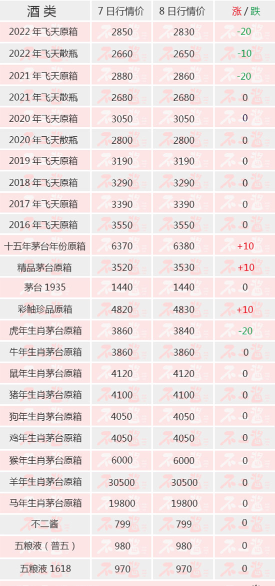 4月8日茅臺酒行情價飛天與生肖跌價。飛天方面,2022與2021年原箱均有20元/瓶的跌幅,2022年散瓶跌價10元/瓶。生肖方面,虎年延續跌勢,今日再跌20元/瓶。其他系列中,十五年、精品、彩釉珍品均有10元/瓶的小幅回漲。