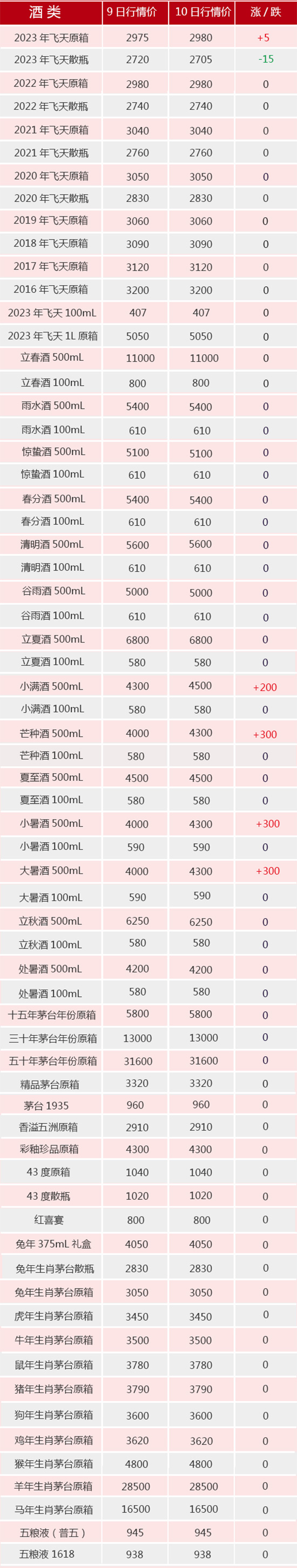 11月10日茅臺(tái)酒行情價(jià)。飛天方面,2023年散瓶跌15元/瓶,2023年原箱漲5元/瓶;生肖方面無動(dòng)價(jià);其他系列,多款大節(jié)氣酒漲200~300元/瓶。