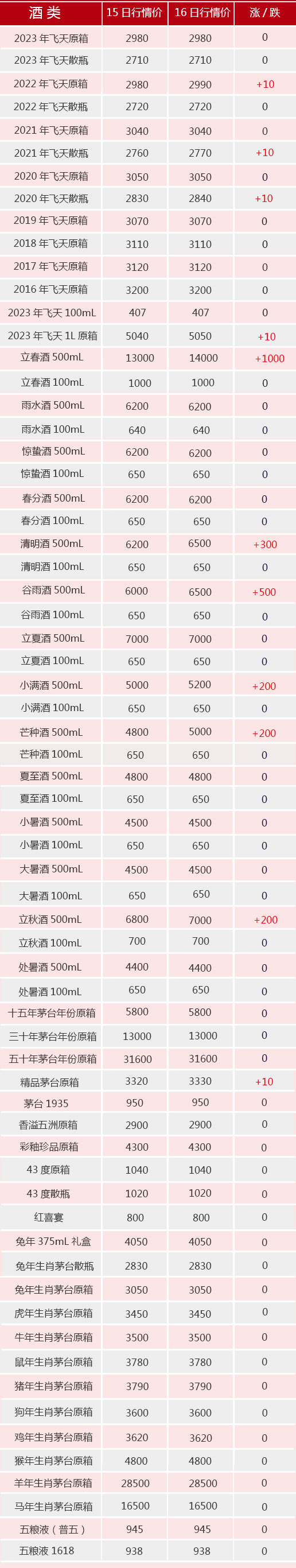11月16日茅臺酒行情價。飛天方面,2021~2022散瓶、2022年散瓶和2023年1L原箱漲10元/瓶;生肖方面無動價;其他系列,大立春酒漲1000元/瓶,多款大節氣酒再漲200~500元/瓶。