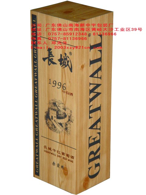 葡萄酒簡介 &nbsp&nbsp&nbsp&nbsp我司是一家以包裝工藝制品為主的公司,致力開發和生產各種包裝工藝制品系列。擁有一批經驗豐富的設計人員;2002年,我司率先在白酒木盒(pvc+高密度板)包裝中應用一次性開啟防偽技術,此乃得到白酒生產企業和白酒經銷商的一至贊賞與認同。在2004年初,我司引進國外先進的包裝制作經驗,采用新型材料,率先在我國葡萄酒包裝市場上推出首創且次的葡萄酒“木皮包裝”。 &nbsp&nbsp&nbsp&nbsp本公司以“質量前列、信譽前列、服務前列”為宗旨,誠摯為各位客戶奉上:葡萄酒(白酒)盒、中秋月餅盒、燕窩盒、茶葉盒、紙巾盒、襯衣盒、化妝品盒、CD盒、藥材盒等各式禮品紙盒、木盒(pvc+高密度板)、實木盒,以及手提紙袋。 工廠:&nbsp廣東佛山南海淳美(新中宇)包裝制品廠 Add:廣東佛山市南海區大瀝鎮黃岐 Tel:&nbsp(+86)0757-85912348、81136966&nbsp&nbsp Fax:&nbsp(+86)0757-85912348聯系人:鄧先生 E-mail:2003xzy@21cn.com